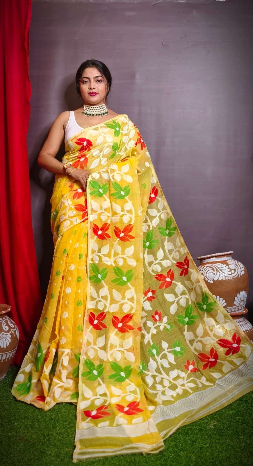• Belpata Saree with intricate leaf motif design for a natural touch of elegance.