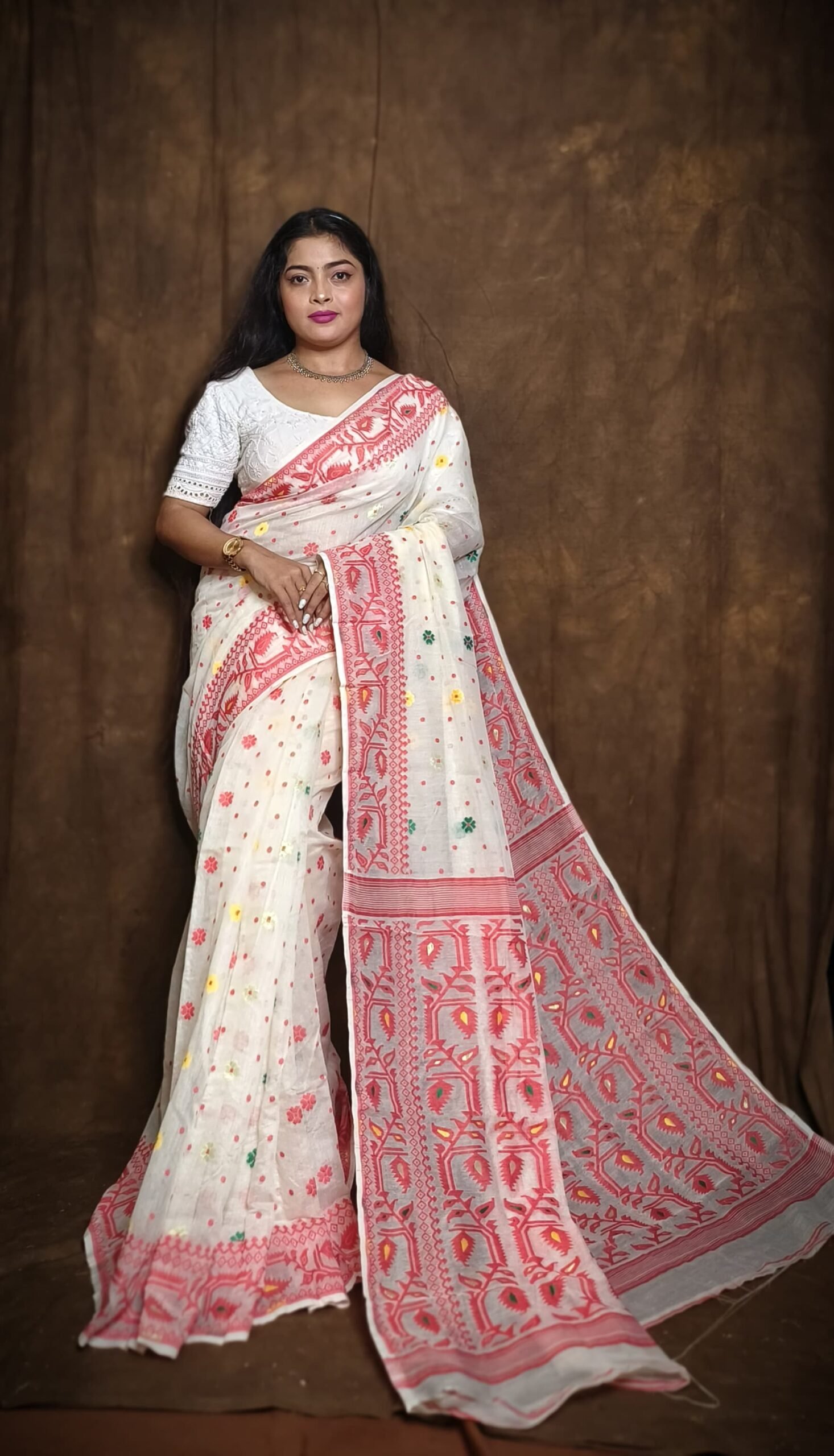 Indulge in the timeless elegance of the Mina Buti Dhakai Jamdani Saree, a perfect blend of traditional artistry and contemporary style. Crafted meticulously by skilled artisans, this saree features intricate Mina Buti designs that reflect the rich heritage of Dhakai Jamdani weaving. Made with premium-quality fabric, it drapes effortlessly, offering a sophisticated and graceful look for any occasion.