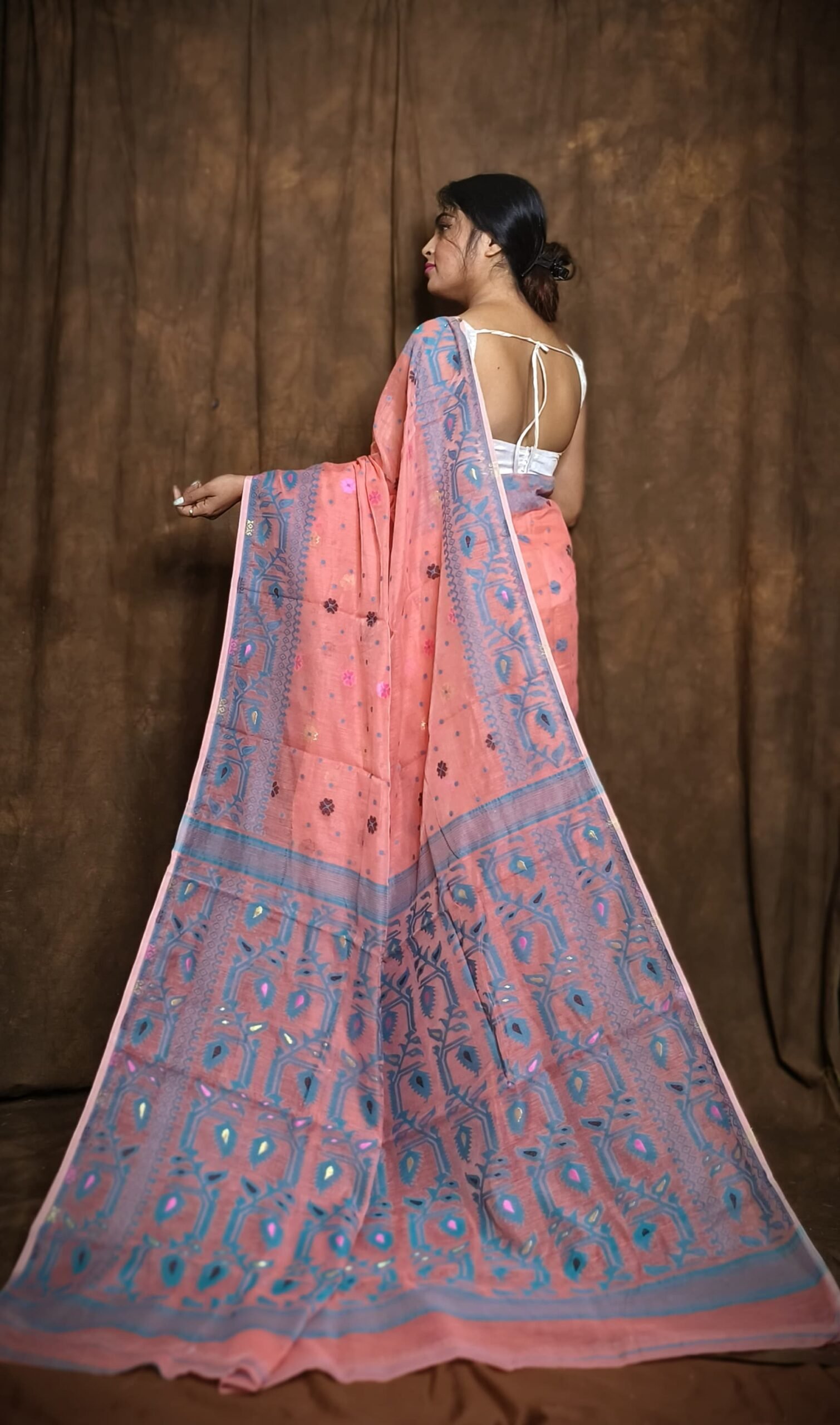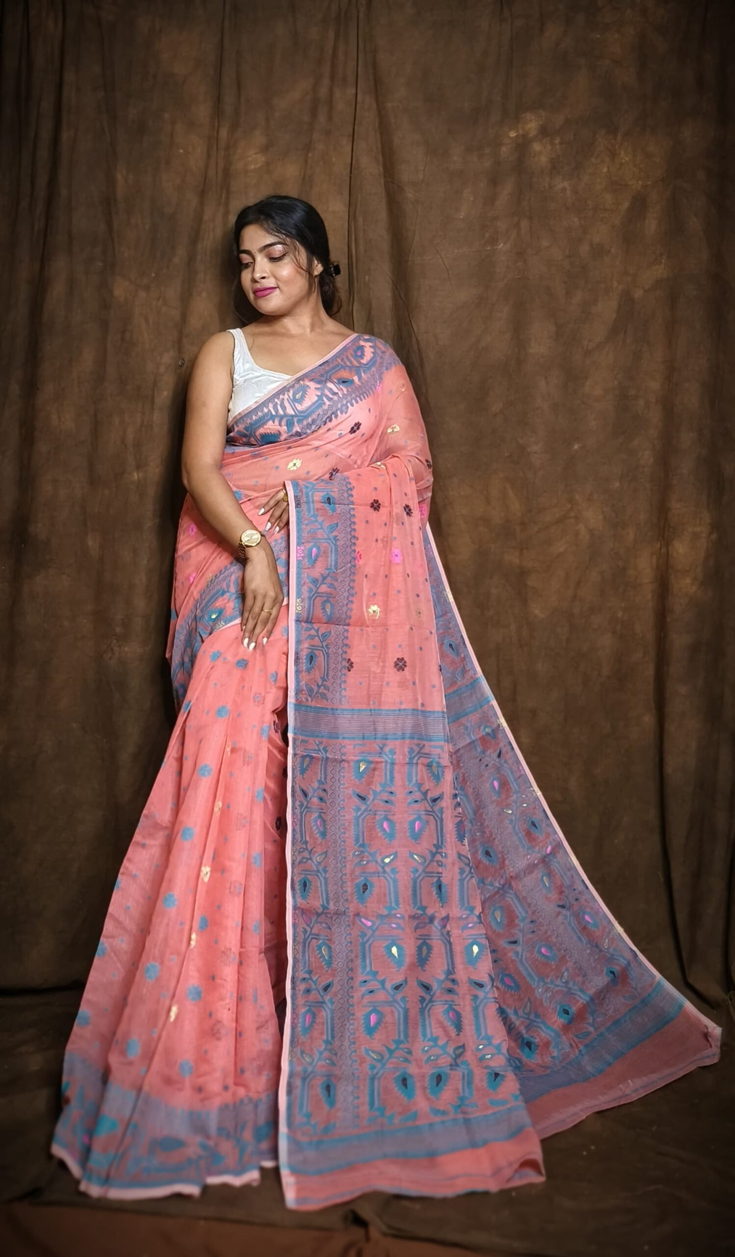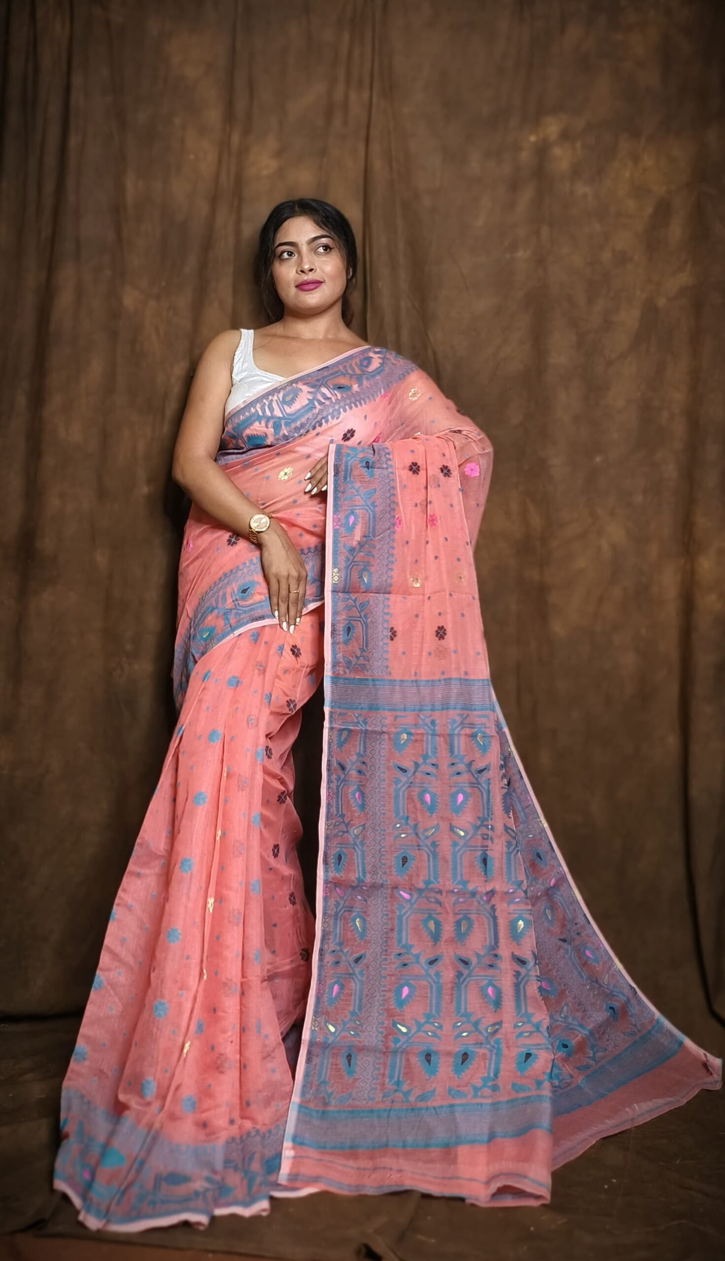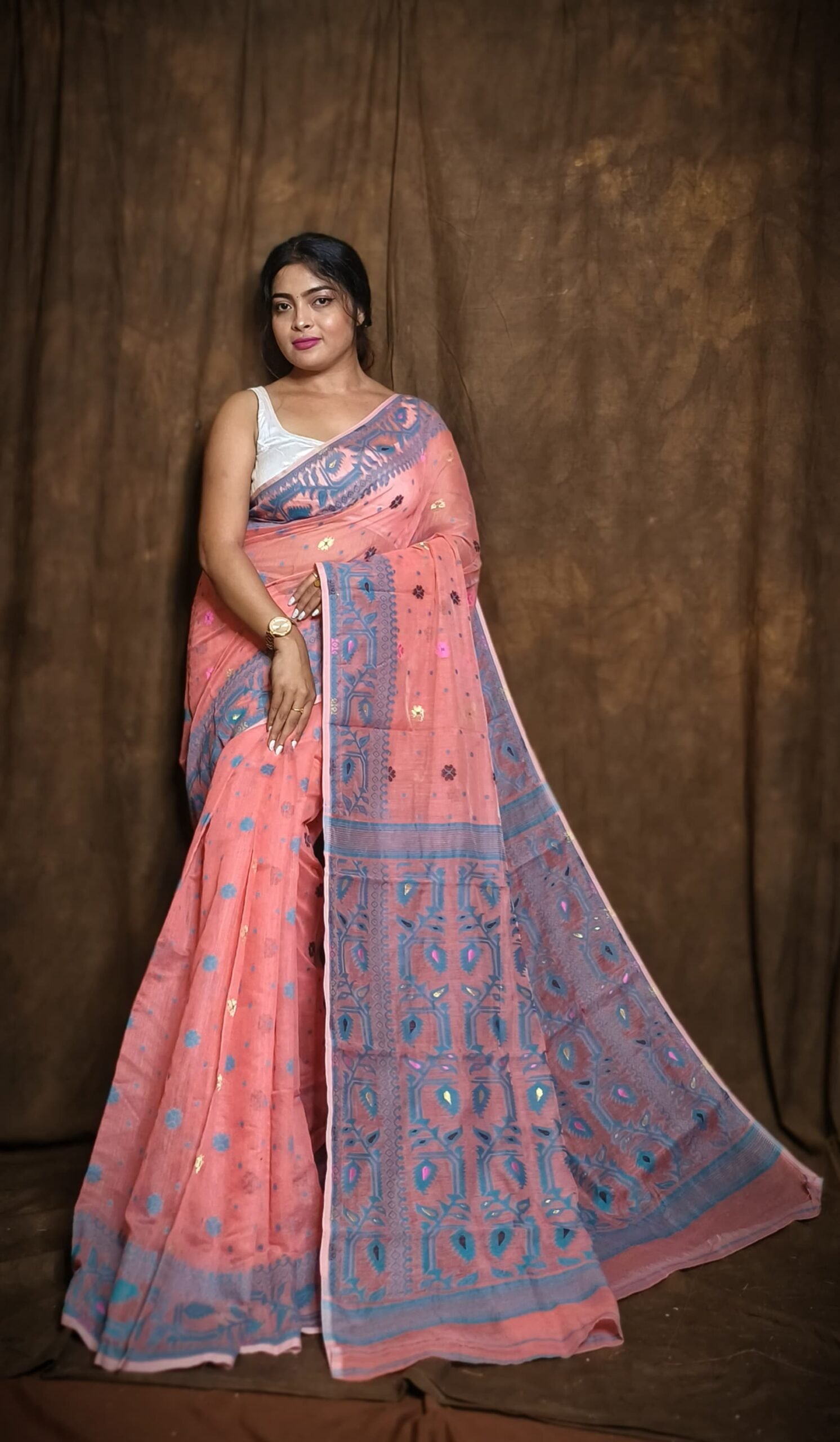 Indulge in the timeless elegance of the Mina Buti Dhakai Jamdani Saree, a perfect blend of traditional artistry and contemporary style. Crafted meticulously by skilled artisans, this saree features intricate Mina Buti designs that reflect the rich heritage of Dhakai Jamdani weaving. Made with premium-quality fabric, it drapes effortlessly, offering a sophisticated and graceful look for any occasion.