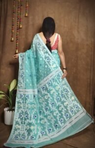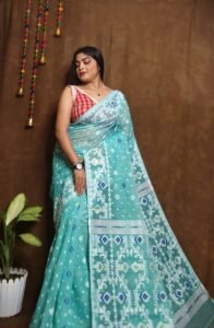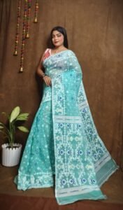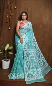 The Exclusive Lata Dhakai Jamdani Saree is a celebration of tradition and artistry, featuring intricately woven floral (lata) patterns that epitomize elegance. This handwoven masterpiece reflects the rich heritage of Dhakai Jamdani weaving, known for its unparalleled craftsmanship. Made with premium-quality fabric, the saree drapes gracefully, offering a perfect blend of style and comfort.