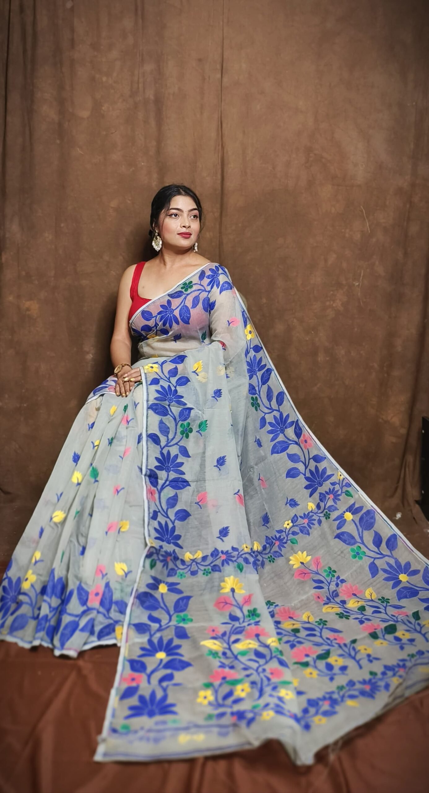 Premium Lata Dhakai Jamdani Saree with Floral Motifs Grey