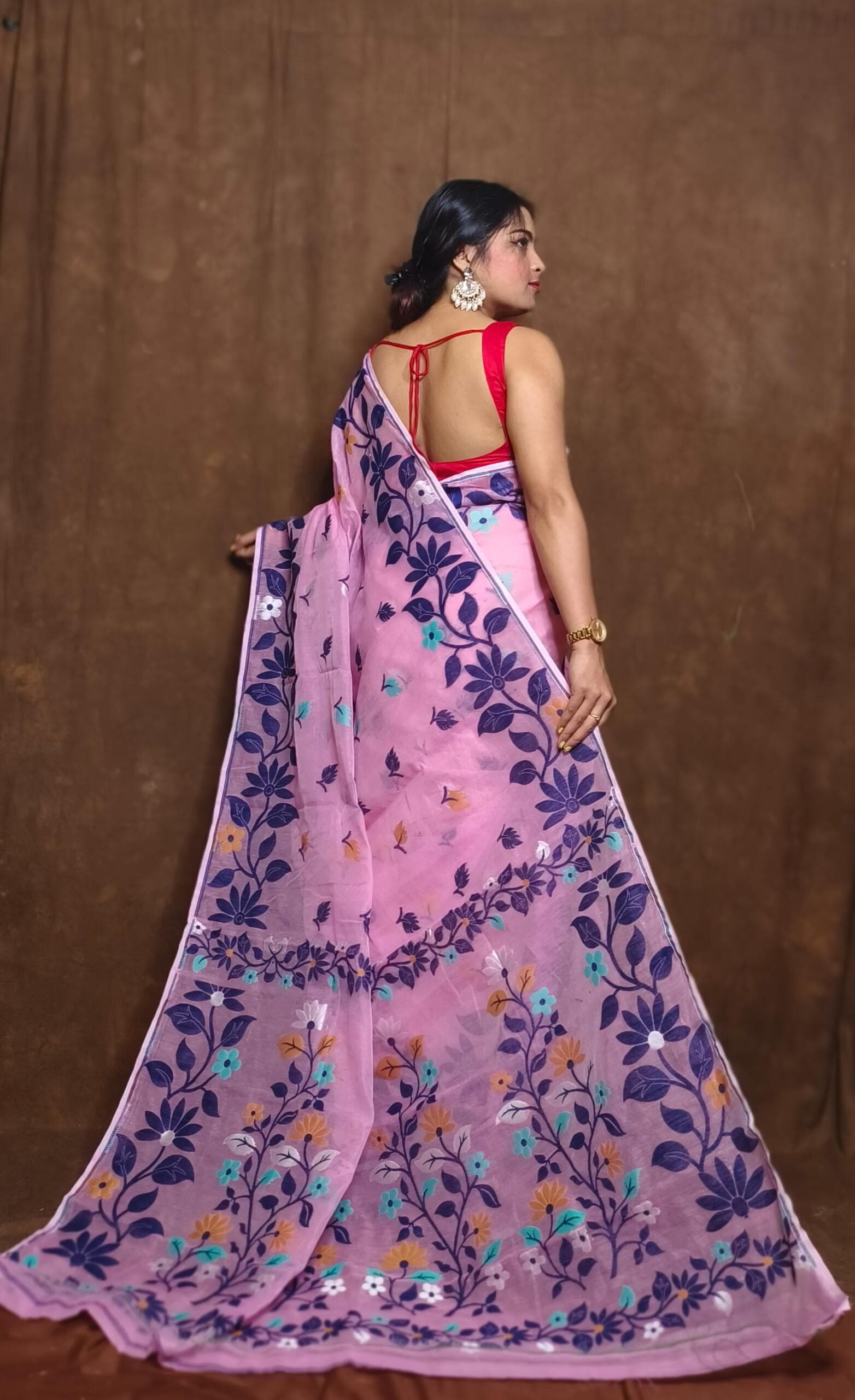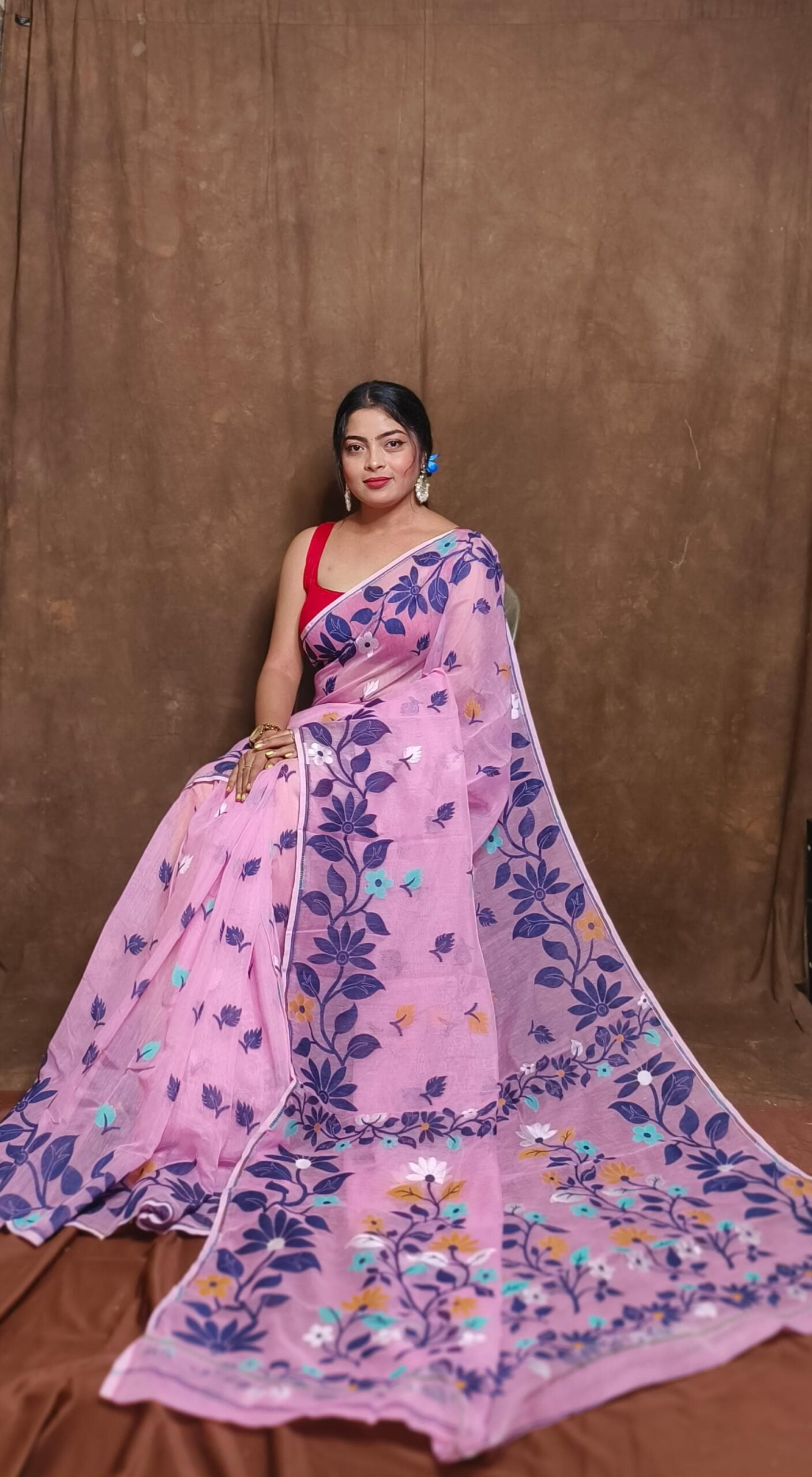 Premium Lata Dhakai Jamdani Saree with Floral Motifs Pink