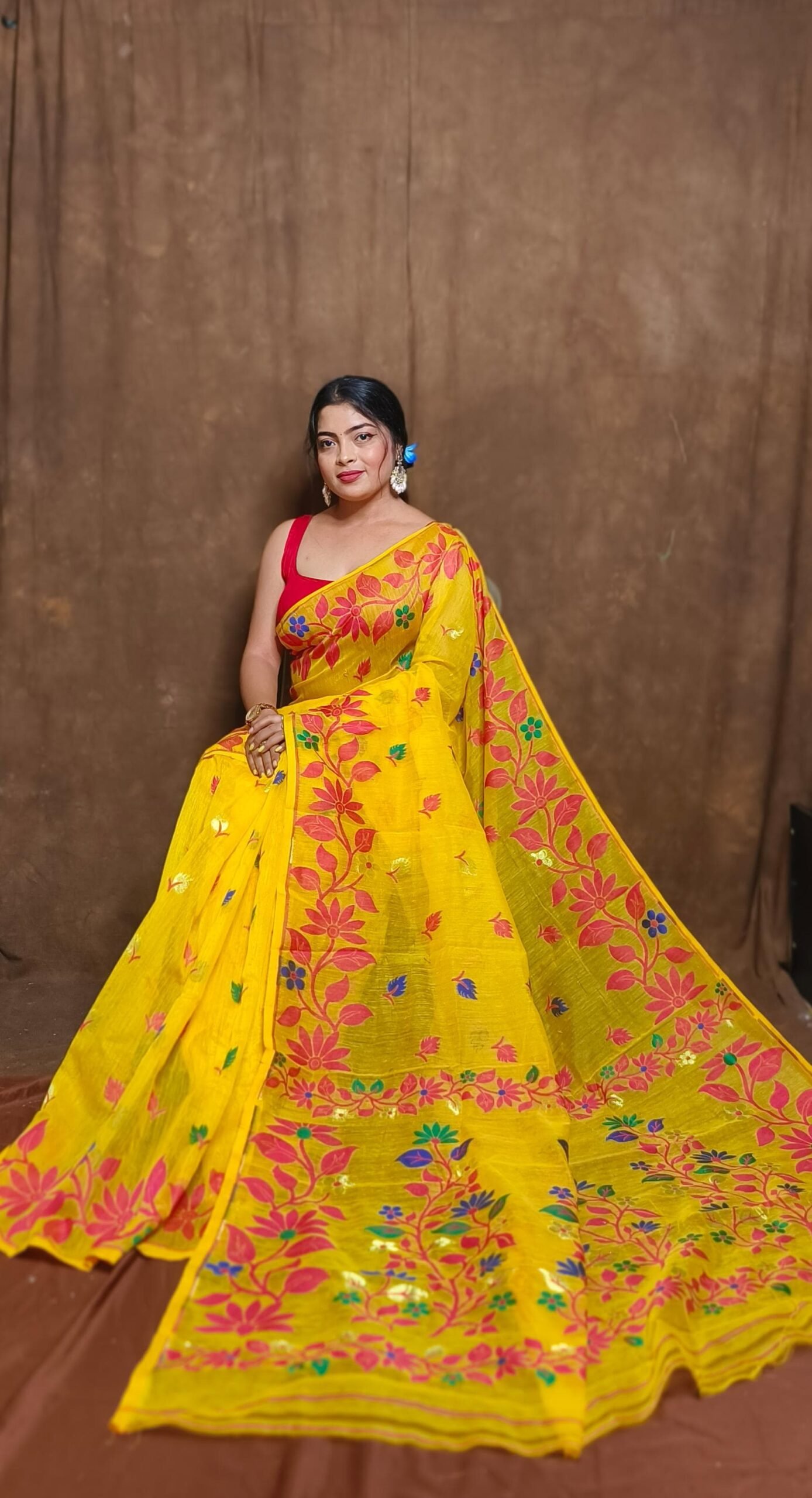 The Exclusive Lata Dhakai Jamdani Saree is a celebration of tradition and artistry, featuring intricately woven floral (lata) patterns that epitomize elegance. This handwoven masterpiece reflects the rich heritage of Dhakai Jamdani weaving, known for its unparalleled craftsmanship. Made with premium-quality fabric, the saree drapes gracefully, offering a perfect blend of style and comfort.