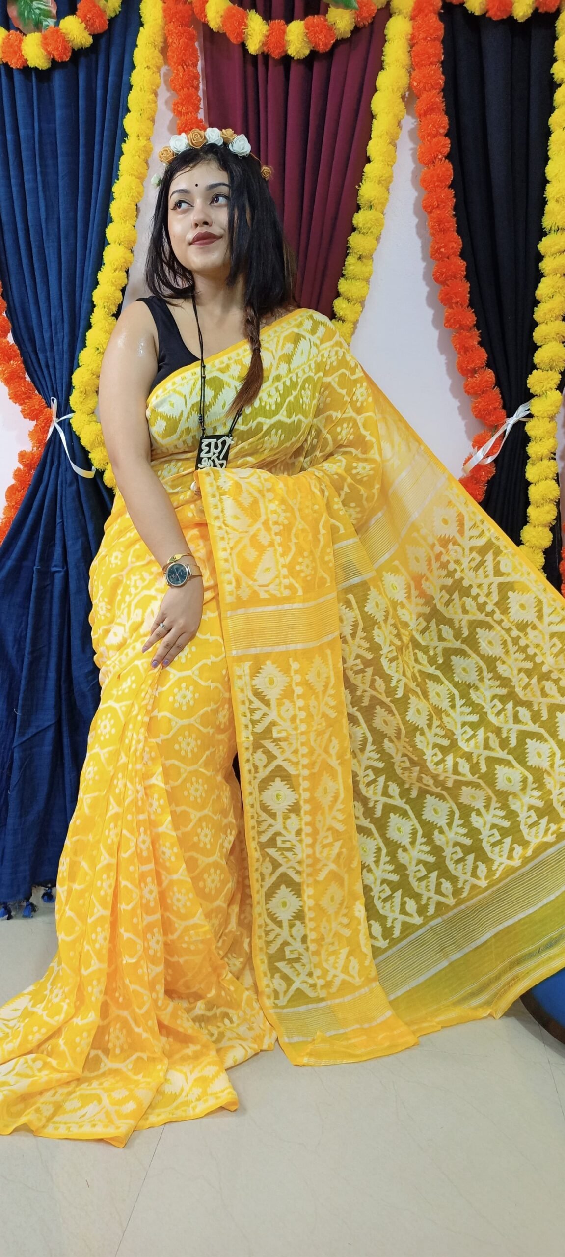 Whether it’s a festive celebration, a wedding, or a formal event, the Siuli Jamdani Saree adds a touch of timeless charm to your wardrobe.